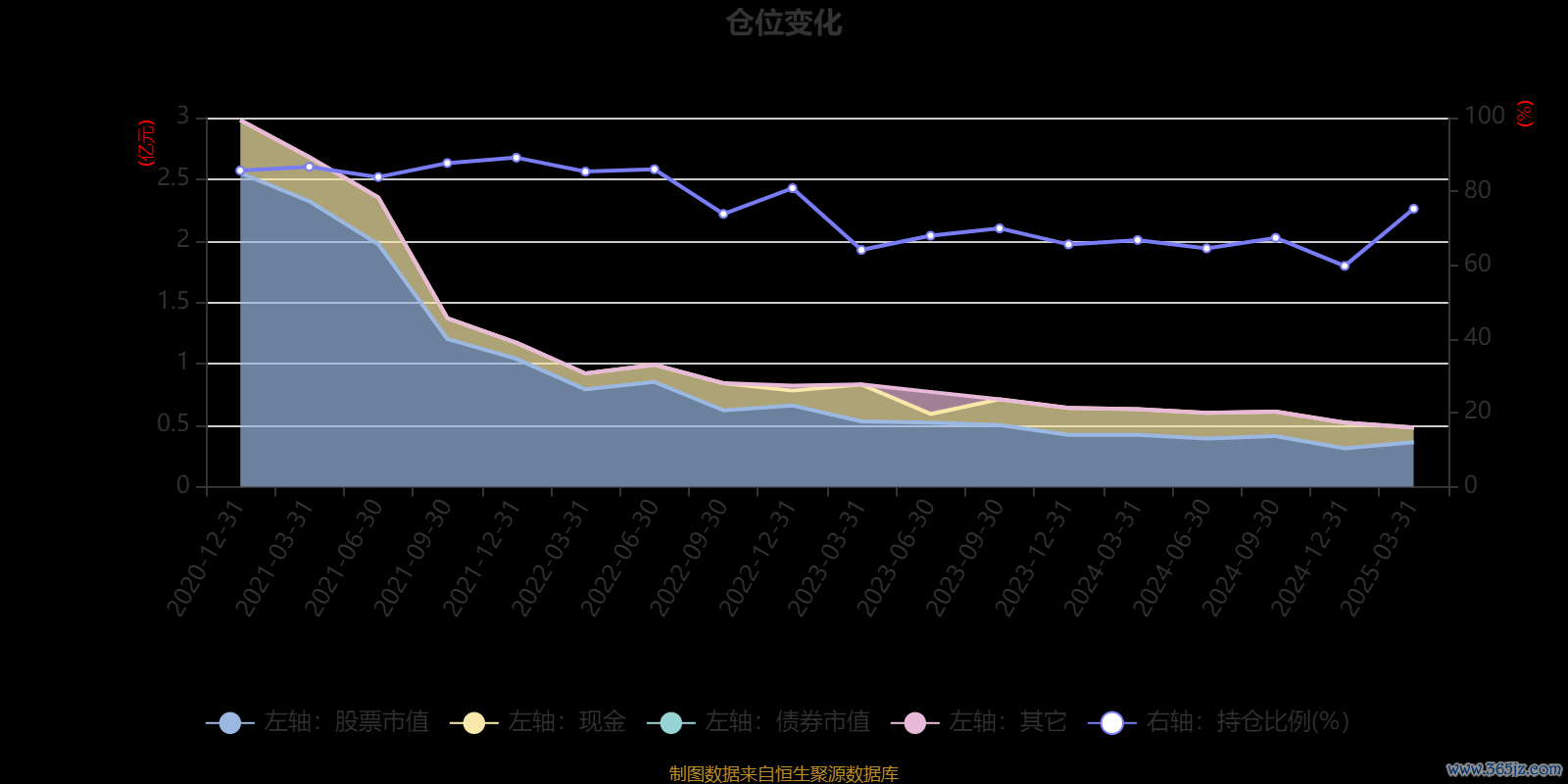 据定期报告数据统计,近三年平均股票仓位为70.2%,同类平均为83.56%。2021年末基金达到89.15%的最高仓位,2024年末最低,为59.8%。