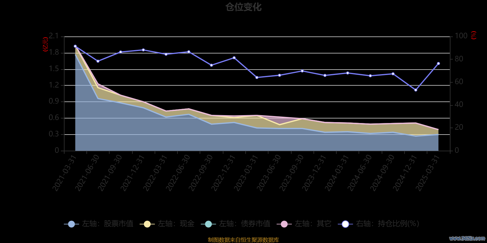 据定期报告数据统计,近三年平均股票仓位为69.94%,同类平均为83.56%。2021年一季度末基金达到91.48%的最高仓位,2024年末最低,为53.18%。